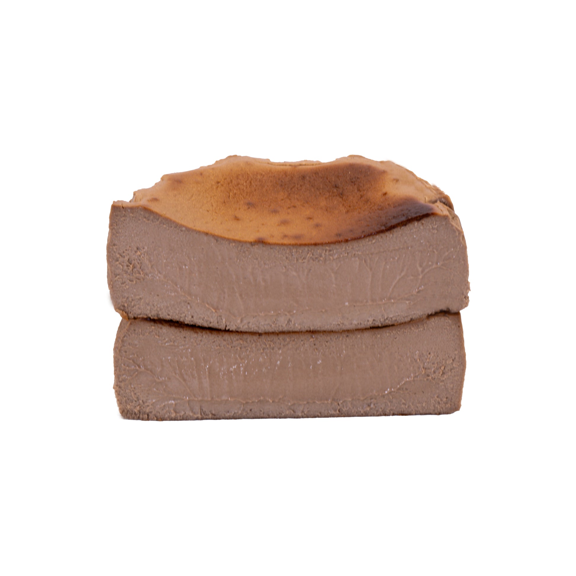 A rich, creamy cheesecake with a caramelized top, infused with premium dark chocolate, creating a delightful blend of smooth and slightly burnt flavors.